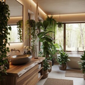 Bring the outdoors inside by incorporating natural elements like stone sinks, wooden accents, and greenery.