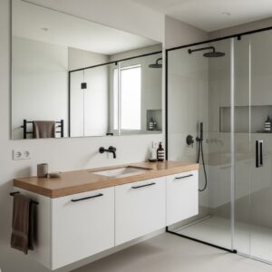 A modern minimalist bathroom focuses on simplicity, clean lines, and clutter-free surfaces.