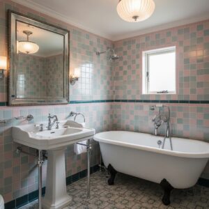 Incorporate colorful tiles, clawfoot tubs, and classic pedestal sinks.