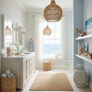 Decorative elements like seashells, driftwood, or ocean-themed artwork enhance the theme without overwhelming it.