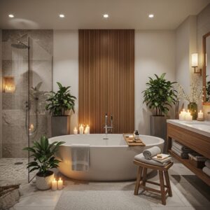Aromatherapy candles and indoor plants complete the serene atmosphere, making your bathroom feel like a personal wellness sanctuary.