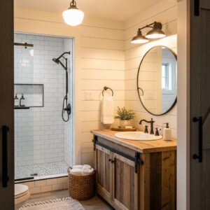 Use shiplap walls, distressed wood vanities, and vintage-inspired fixtures like oil-rubbed bronze faucets.