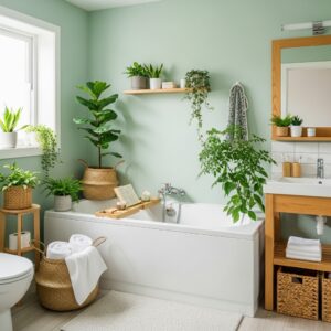 Choose low-maintenance options like ferns or snake plants that thrive in humidity.