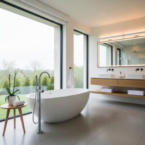 Wooden vanities, stone sinks, or small indoor plants can soften the look of modern fixtures and create a relaxing, spa-like environment.