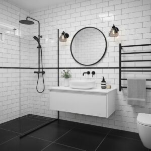 Use white tiles or walls as a base and add black fixtures, frames, or accents for contrast.