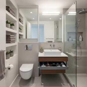 Maximize space with built-in shelves, recessed cabinets, and vanity organizers.