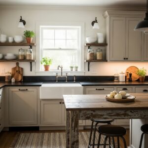 Add open wood shelving and black hardware for a warm farmhouse-meets-modern look.