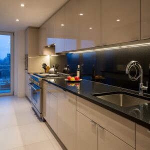 The smooth reflective surface enhances the softness of beige cabinetry, giving the kitchen an elegant upscale feeling.
