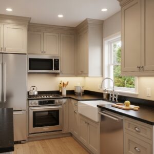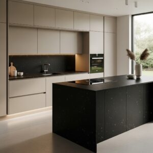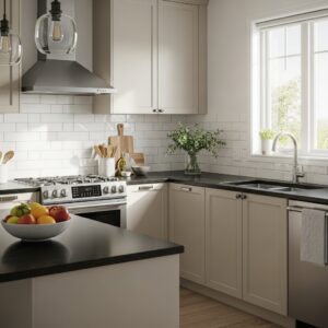 Shaker cabinets in beige instantly feel cleaner and more structured when matched with matte black countertops.