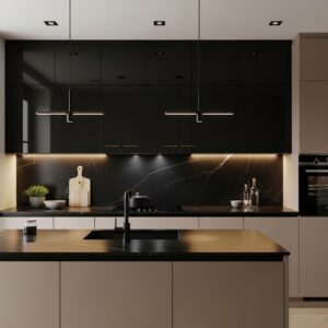 The trio of beige, black, and gold creates a balanced, luxurious palette ideal for high-end kitchen designs.