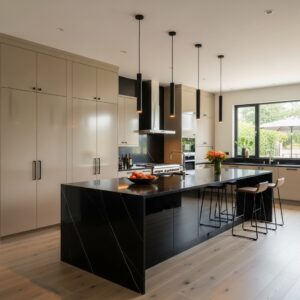 A waterfall island in black quartz or granite becomes a statement piece when paired with beige perimeter cabinets.