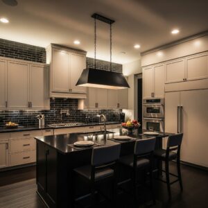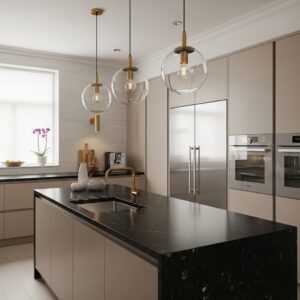 Strategic lighting—like gold, glass, or matte black pendants—can highlight the contrast between beige and black.