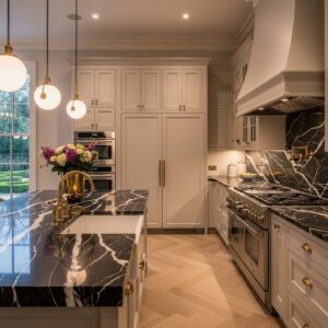 For a luxurious choice, black marble with white or gold veining looks stunning against beige cabinets.