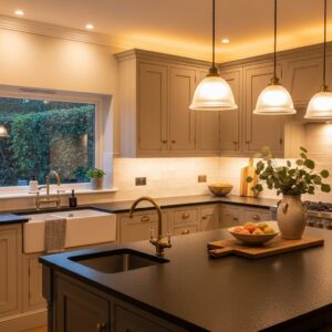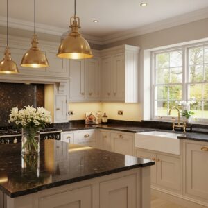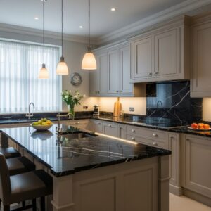 Black countertops act as a perfect base for gold hardware, fixtures, or lighting accents. Against beige cabinets, this creates a warm, luxurious vibe.