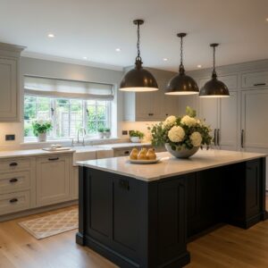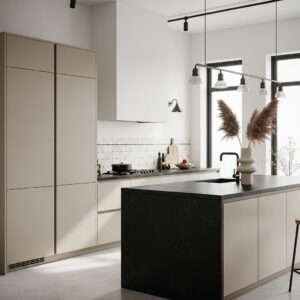 Pair beige cabinets with a matte black island to create a striking two-tone effect.