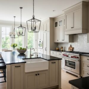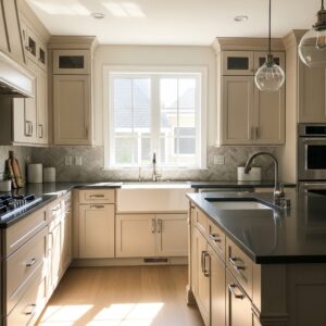 Beige cabinets paired with black countertops create a striking, timeless kitchen aesthetic.