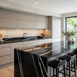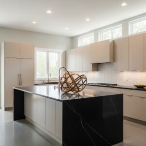 Black quartz countertops with white veining paired with beige cabinets create subtle contrast and a layered, elegant look.