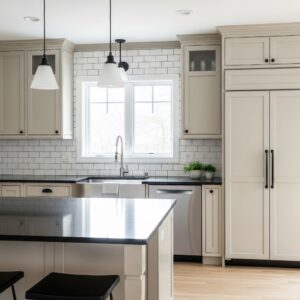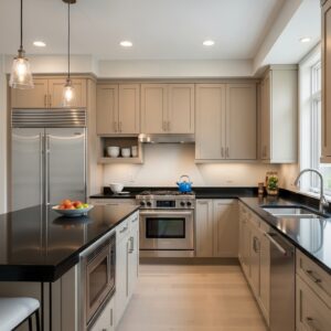 Greige cabinets combined with deep black counters give a contemporary neutral palette with a subtle gray undertone.