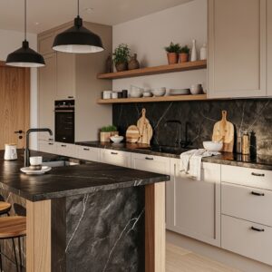 Textured black countertops—like honed granite or volcanic stone—paired with beige cabinets add depth and character, creating a bold yet welcoming kitchen atmosphere.