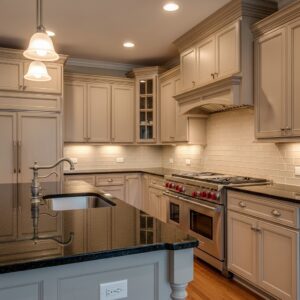 Light beige cabinets with polished black granite countertops create a classic, high-end feel.