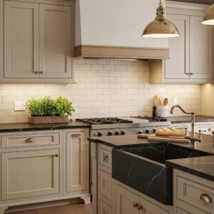 Taupe-beige cabinetry combined with black marble countertops featuring subtle white veining creates a luxurious, timeless aesthetic with visual interest.