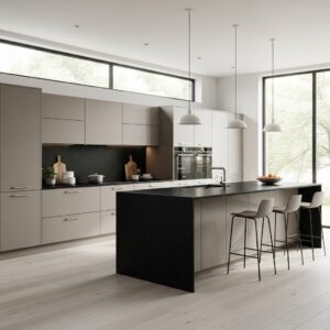 The warmth of beige softens the boldness of black surfaces, creating a balanced, elegant, and versatile space.