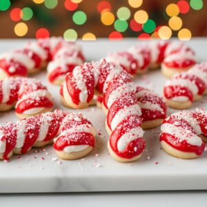 These colorful cookies are shaped like candy canes using red and white dough twisted together.