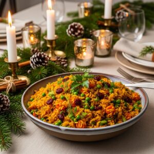 Cook rice with onions, garlic, and broth, then stir in peas, carrots, herbs, or dried fruit like cranberries for a festive twist.