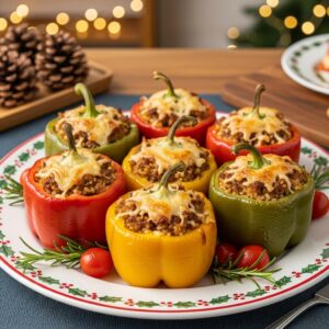 Add holiday flavors like garlic, tomato sauce, and cheese, then bake until the peppers are soft and the filling is fragrant.