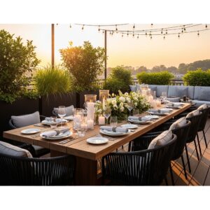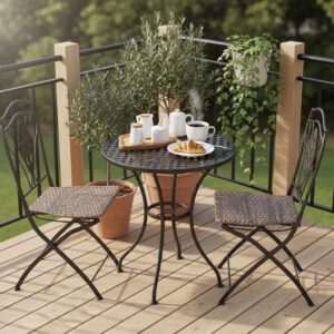 For compact decks, a simple bistro table and two chairs tucked into a corner can create a charming and functional layout.