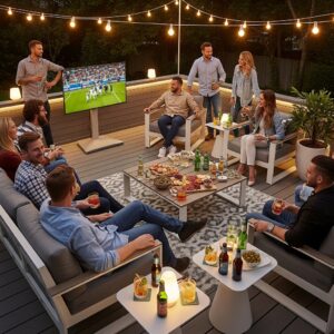 Create a central seating area facing a focal point like an outdoor TV, projector screen, or music setup.