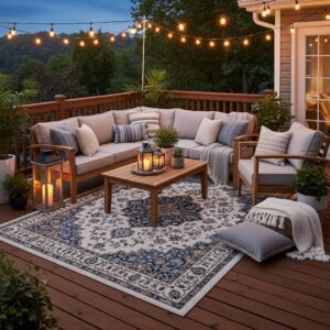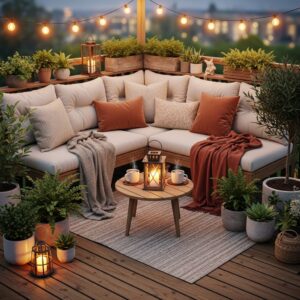 Add throw pillows, blankets, and an outdoor rug to make the space feel cozy and inviting.