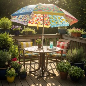 An outdoor umbrella doesn’t need to be brand new — repaint an older one with weather‑resistant paint and refresh its stand with a new base.
