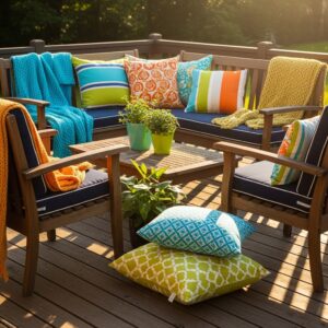 Choose colors that match your deck theme and arrange the cushions on simple chairs, benches, or even pallet seating.