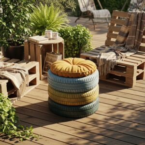 Old tires can be repurposed into a quirky budget ottoman.