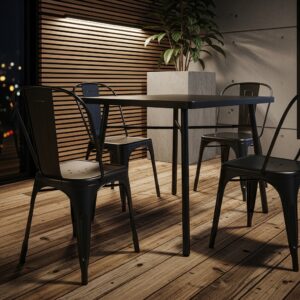 Industrial-style steel chairs or benches add a contemporary edge to your outdoor space.