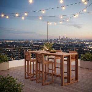 A bar-height table paired with matching stools creates a casual and modern deck setup.