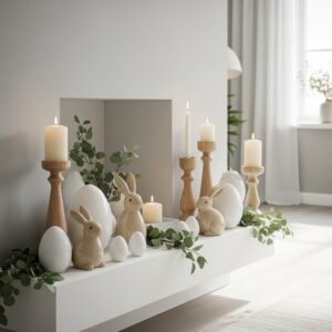 Use white ceramic eggs, beige bunnies, light wood candle holders, and soft greenery.