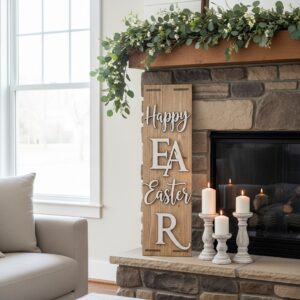 Add a wooden or framed Easter sign with phrases like “He Is Risen,” “Happy Easter,” or “Welcome Spring.”