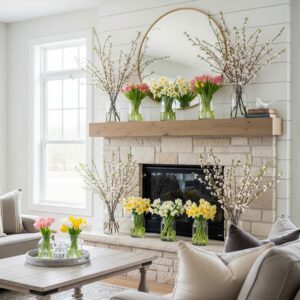 Place glass or ceramic vases filled with tulips, daffodils, lilies, or cherry blossom branches along your mantle.
