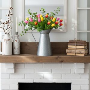 Place a large ceramic or galvanized metal pitcher filled with fresh or faux flowers in the center of your mantle.