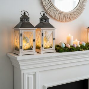 Lanterns are versatile and timeless. Fill them with pastel eggs, fairy lights, moss, or small bunny figurines.