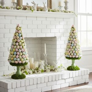 Create or purchase small egg topiary trees made from pastel eggs arranged in cone shapes.