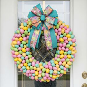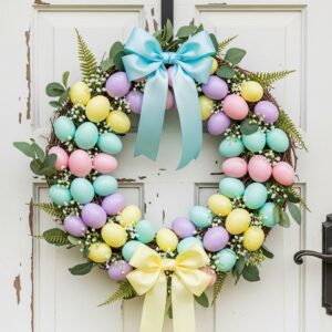 This timeless Easter wreath features soft pastel plastic eggs arranged evenly around a grapevine or foam wreath base.