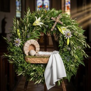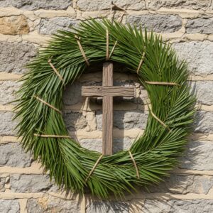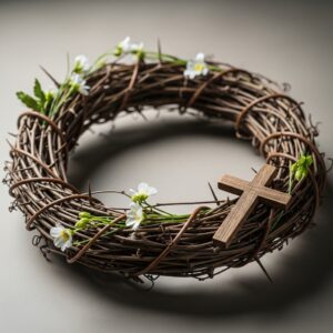 A crown of thorns wreath serves as a solemn reminder of Christ’s suffering and ultimate triumph.
