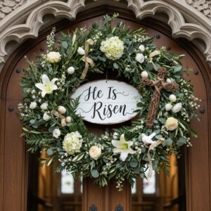 A wreath featuring the words “He Is Risen” immediately proclaims the heart of Easter.