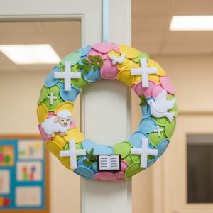 Designed with gentle colors and simple Christian symbols, this wreath is perfect for Sunday school rooms or children’s church entrances.