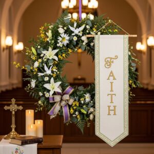 Some churches prefer wreaths combined with vertical banners displaying words like Faith, Hope, or Resurrection.