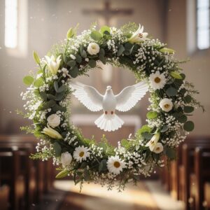 A dove-themed Easter wreath often uses white accents, greenery, and gentle floral touches.