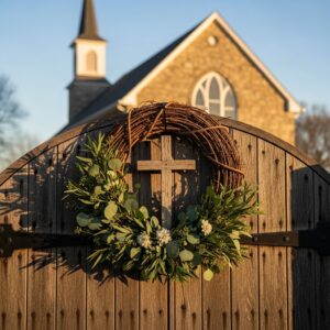 This wreath fits especially well in country churches or outdoor entryways, blending natural beauty with spiritual symbolism.